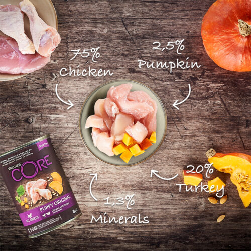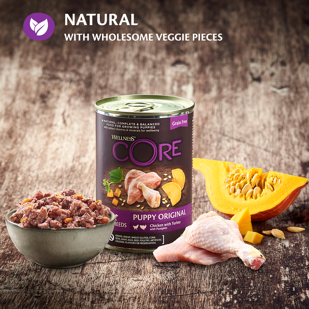 Vores Wellness CORE Puppy Original Kylling med kalkun og Græskar er en lækker kornfri opskrift, som giver din hvalp et helt naturlig, komplet og afbalanceret måltid, fremstillet med 95 % af animalske ingredienser fra en dobbelt proteinkilde og beriget med vitaminer og mineraler, det sikrer, at din hvalp får den bedste start på livet.