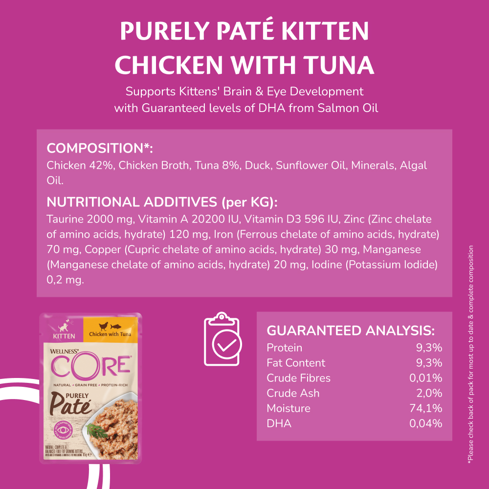 For a lifetime of well-being, our Wellness CORE Purely Paté Kitten recipe is crafted specially for kittens to support brain and eye development thanks to guaranteed levels of DHA from salmon oil. This delicous smooth paté recipe delivers the natural nutrition your kitten craves and is an excellent source of high quality proteins to promote healthy growth.
