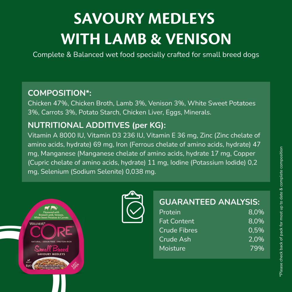 Our Wellness CORE Small Breed Savoury Medleys are specially created for small breed dogs. A delicious taste, exciting textures and a daily variety with mouth-watering cuts of meat and wholesome veggies you can see in a delicious sauce.