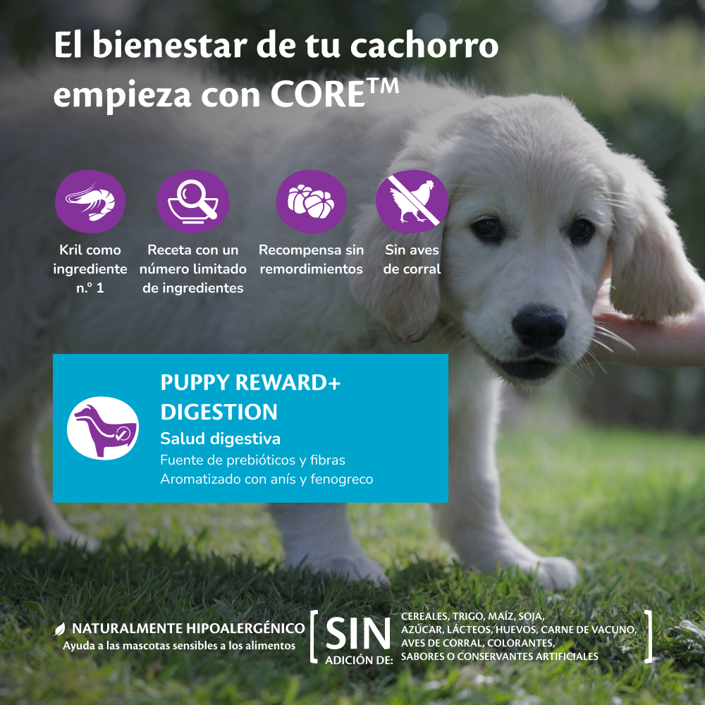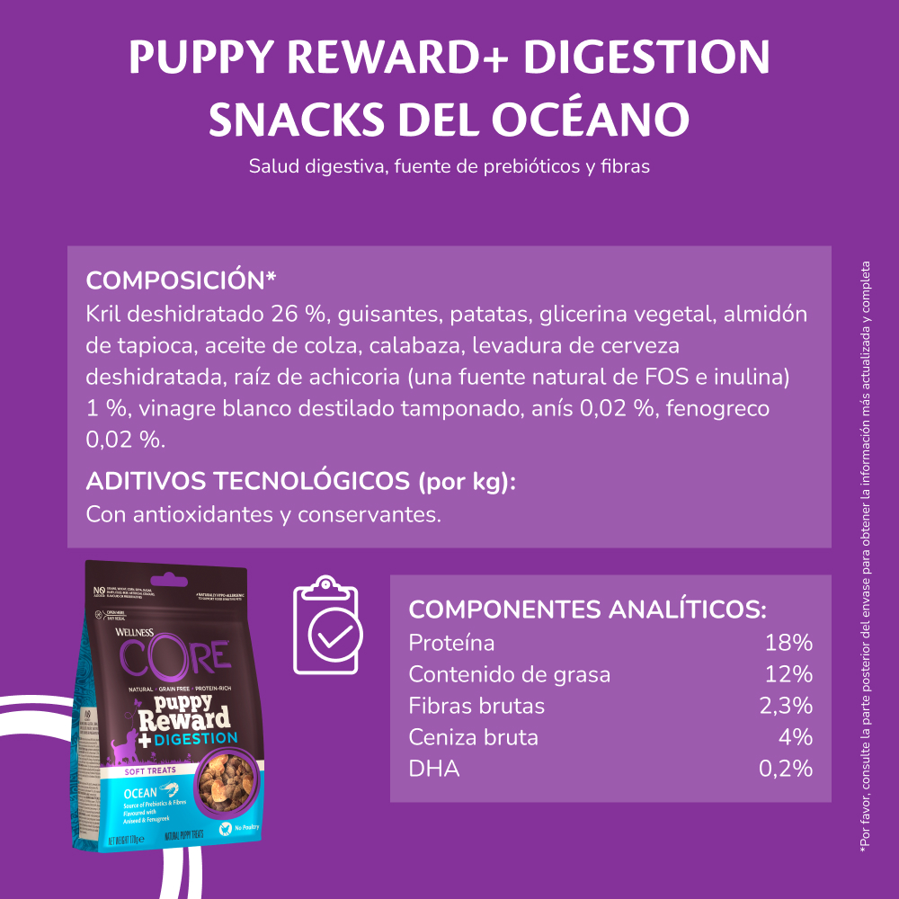 En Wellness CORE, creemos que las golosinas deben hacer más que simplemente saber bien. Nuestras golosinas blandas Puppy Reward+ Ocean no contienen aves y están elaboradas con proteínas marinas de alta calidad que a los cachorros les encantan. Enriquecidas con DHA procedente del krill para apoyar el desarrollo del cerebro y la vista, además de prebióticos, fibras, anís y alholva para una digestión saludable, son la forma perfecta de premiar mientras se nutre el crecimiento de su cachorro.