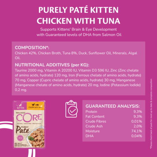 Para toda una vida de bienestar, nuestra receta Wellness CORE Purely Paté Kitten está elaborada especialmente para los gatitos y favorece el desarrollo del cerebro y los ojos gracias a los niveles garantizados de DHA procedentes del aceite de salmón. Esta deliciosa y suave receta de paté proporciona la nutrición natural que su gatito anhela y es una excelente fuente de proteínas de alta calidad para promover un crecimiento saludable.