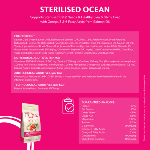 Viljaton ja korkeaproteiininen luonnollinen ravitsemus. Tämä ravinnerikas resepti auttaa tukemaan optimaalista terveyttä, painoa ja pitkäikäisyyttä kissoilla. Runsaasti laadukkaita proteiinipitoisia raaka-aineita: luonnollinen, täydellinen ja tasapainoinen resepti sekä ainutlaatuinen sekoitus terveellisiä vihanneksia, superfoods, kasviksia ja ravintolisiä, Wellness CORE Sterilized Salmon tarjoaa lihansyöjän perimän omaavalle kissalle aterian, jota he rakastavat. Alennettu kaloripitoisuus tässä tuotteessa soveltuu vähemmän aktiivisen tai steriloidun/kastroidun kissan pienempään energiantarpeeseen. Siipikarjavapaa resepti. Tämä tuote sopii täydellisesti kissoille, jotka tarvitsevat vaihtoehtoisia proteiinilähteitä tai herkille kissoja, jotka eivät voi syödä siipikarjaperäisiä raaka-aineita.