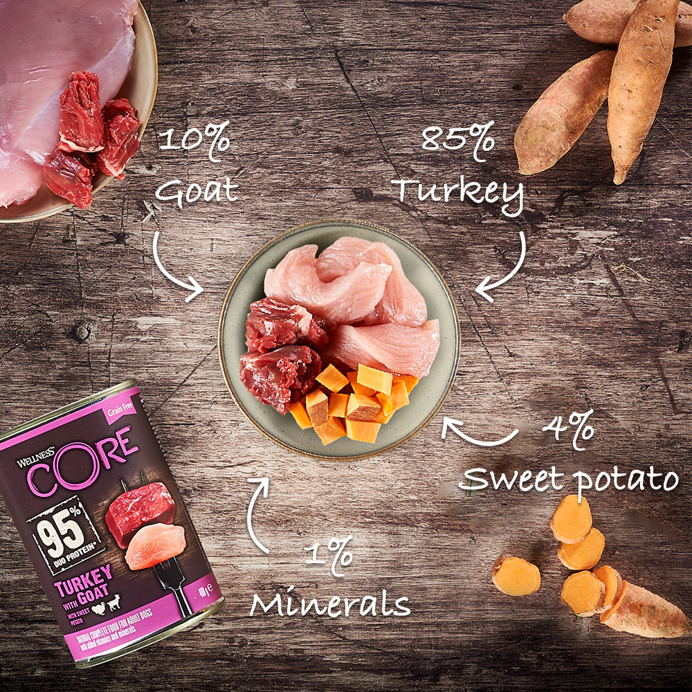 Notre recette Wellness CORE 95% à la Dinde, Chèvre et Patate Douce est une déliceuse recette qui offre à votre chien un repas 100% naturel, complet et équilibré. Composée avec 85% de Dinde, 10% de Chèvre et combinée tout simplement avec de délicieux morceaux de Patate douce, cette recette sans céréales et enrichie avec des vitamines et des minéraux apportera à votre chien tout ce dont il a besoin pour être au top de sa forme.