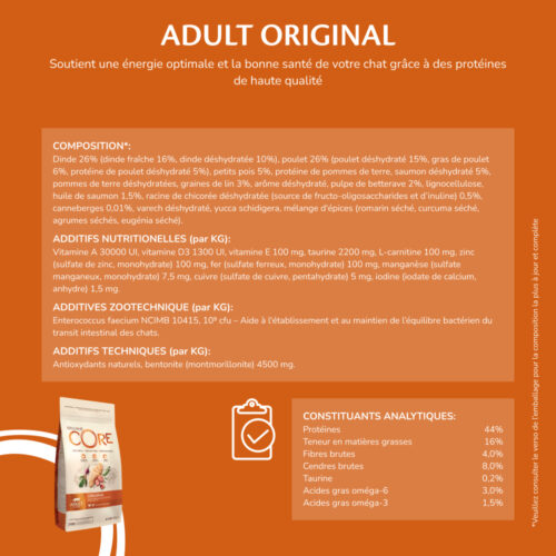 La recette Wellness CORE Adult Original est formulée de sorte à soutenir une énergie optimale et la bonne santé de votre chat grâce à des protéines de haute qualité.