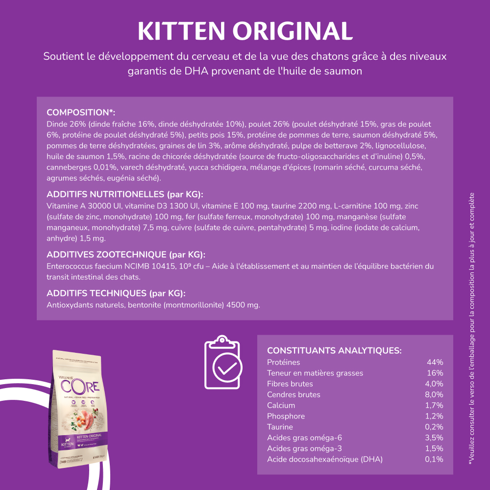 Garanti sans céréales ni agents de remplissages, la recette Wellness CORE Kitten original est la recette parfaite pour offrir à votre chaton le meilleur départ dans la vie et l'aider à devenir un chat adulte en bonne santé et aut top de sa forme.