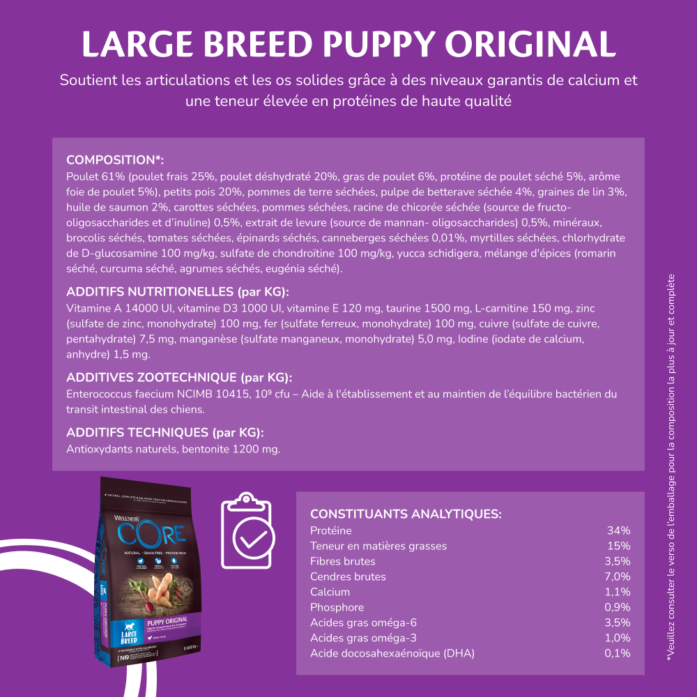 Wellness CORE Large Breed Puppy Original soutient les articulations et les os solides grâce à des niveaux garantis calcium et une teneur élevée en protéines de haute qualité Notre recette Large Breed Puppy Original est formulée pour nutritionnellement répondre aux besoins des chiots en pleine croissance et favoriser un développement sain du squelette et de la masse musculaire. Conçue avec des niveaux de calcium et phosphore adaptés, et combinée avec des ingrédients parfaitement équilibrés, cette recette aidera votre chiot dans ses apprentissage et l'aidera à apprendre rapidement à devenir un grand chien au top de sa forme. Le taux de protéines, de matières grasses, de glucides et le niveau de calories sont parfaitement dosés afin d'apporter aux chiots de grande taille toute l'énergie et les apports nutritionnels nécessaires pour offrir aux chiots le meilleur départ dans leur nouvelle vie.