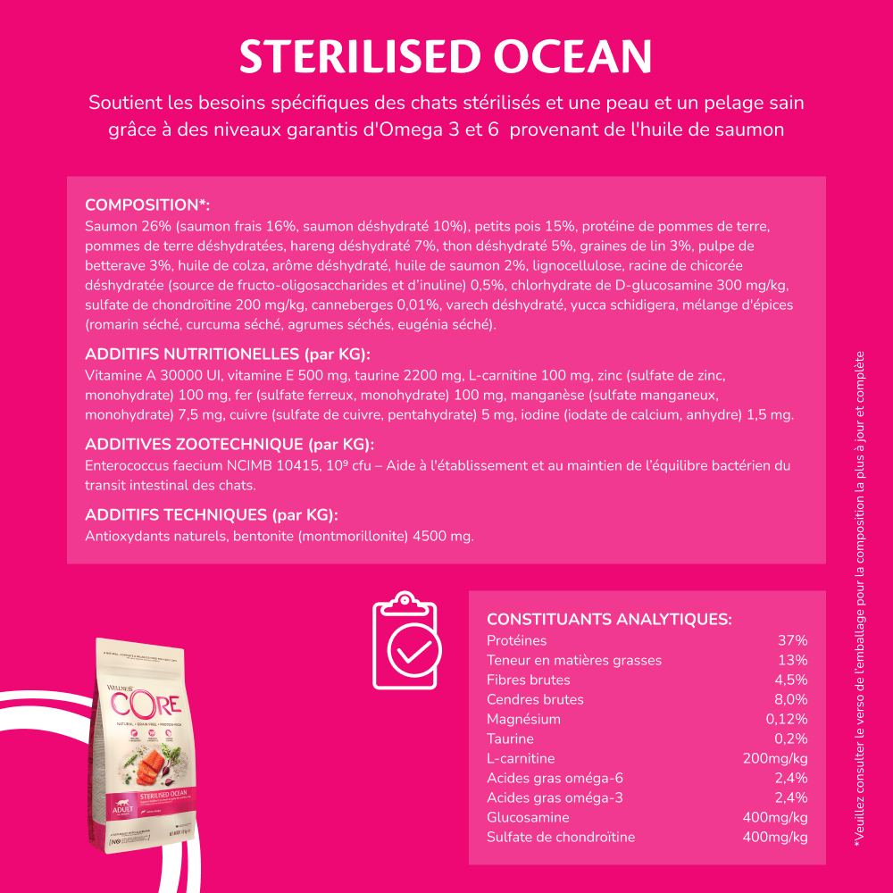 Notre recette Wellness CORE Sterilised Ocean est formulée de sorte à soutenir les besoins spécifiques des chats stérilisés et une peau et un pelage sain grâce à des niveaux garantis d'Omega 3 et 6 provenant de l'huile de saumon.