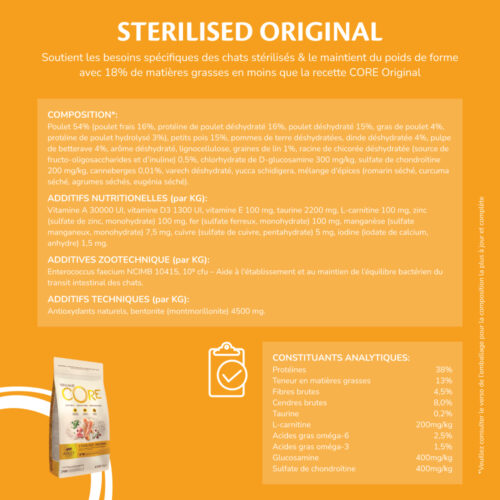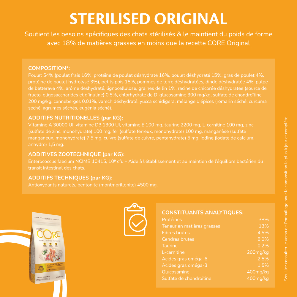 Notre recette Wellness CORE Sterilised Original est formulée de sorte à soutenir les besoins spécifiques des chats stérilisés & le maintient du poids de forme avec 18% de matières grasses en moins que la recette CORE Original.