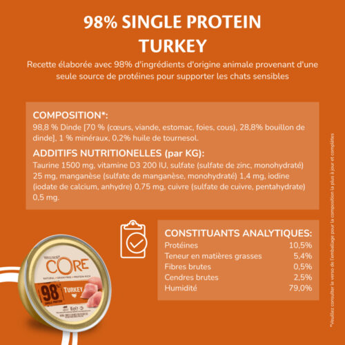 Notre recette Wellness CORE 98%* à la Dinde est une déliceuse recette qui offre à votre chat un repas 100% naturel, complet et équilibré. Composée avec plus de 98% de dinde provenant d'une seule source de protéine, elle convient parfaitement aux chats dont les estomacs sont sensibles. Un pâté délicieux et savoureux qui offre à votre chat l'alimentation dont il a besoin pour être au top de sa forme. *Avec minimum 98% d'ingrédients d'origine animale provenant d'une seule source de protéine