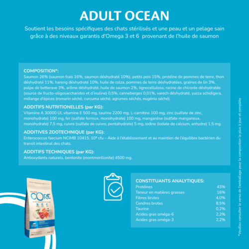 Notre recette Wellness CORE Adult Ocean est conçue à partir de protéines animales de très haute qualité, auxquelles est ajouté un mélange de délicieux légumes, de superaliments, plantes et compléments alimentaires. Garanti sans céréales ni agents de remplissages.