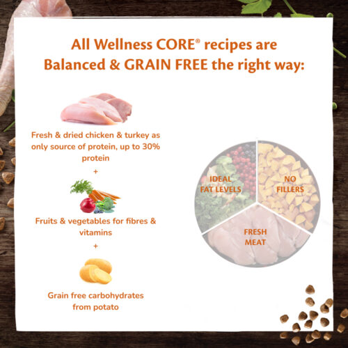 Notre recette Wellness CORE Small Breed Adult Original est une recette conçue dans le but d'apporter une énergie optimale à votre petit chien tout au long de la journée et soutenir la bonne santé de votre petit compagnon grâce à des protéines de haute qualité. Toutes nos recettes sont conçues à partir de protéines animales de très haute qualité, auxquelles sont ajoutés un mélange de délicieux légumes, de superaliments, plantes et compléments alimentaires. Garanti sans céréales ni agents de remplissages, Wellness CORE Small Breed Adult Original offre comme ingrédient N°1 de la dinde fraîche pour un repas savoureux.