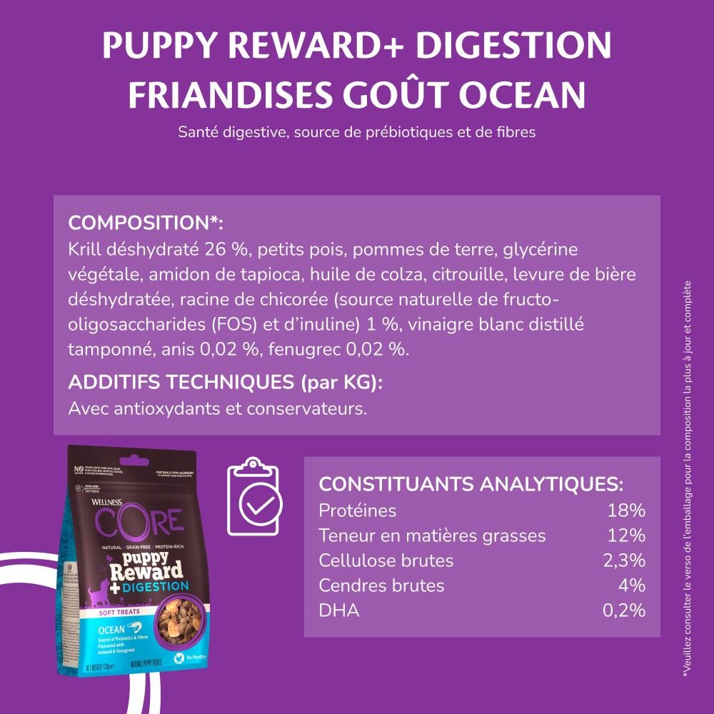 Chez Wellness CORE, nous croyons que les friandises doivent offrir plus qu’un simple bon goût. Nos friandises moelleuses Puppy Reward+ Ocean Recipe sont sans volaille et élaborées avec des protéines marines de qualité que les chiots adorent. Enrichies en DHA issu du krill pour soutenir le développement du cerveau et des yeux, ainsi qu’en prébiotiques, fibres, anis et fenugrec pour une digestion saine, elles sont la façon idéale de récompenser tout en nourrissant la croissance de votre chiot.