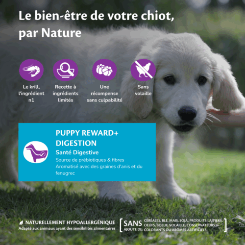 Nos friandises Reward+ rendent l’entraînement délicieux tout en apportant des bienfaits pour la santé. La recette Puppy Reward+ Ocean est sans volaille, avec des prébiotiques et des fibres pour la digestion, et du DHA issu du krill pour le développement du cerveau et des yeux.