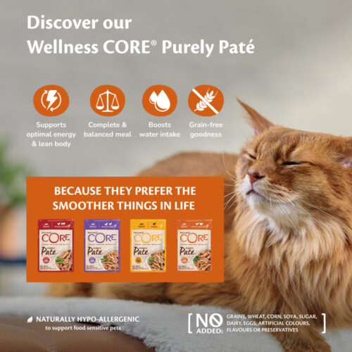 Nos recettes Wellness CORE sont basées sur la philosophie nutritionnelle selon laquelle les chats, étant donné leurs ancêtres primitifs, s'épanouissent grâce à un régime principalement composé de viande. Un délicieux pâté onctueux que les chats adorent et une saveur riche en protéines qu'ils recherchent, notre gamme Wellness CORE Purelyé Paté sera certainement un succès, même pour les félins les plus difficiles !