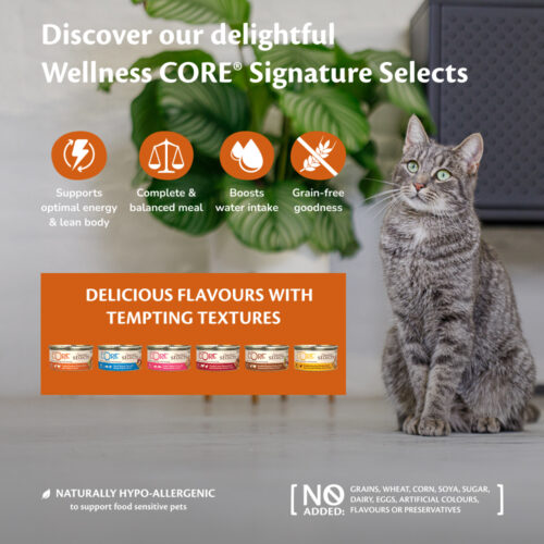 Wellness CORE Signature Selects au thon émietté et aux crevettes au bouillon est un aliment complet pour chats adultes.