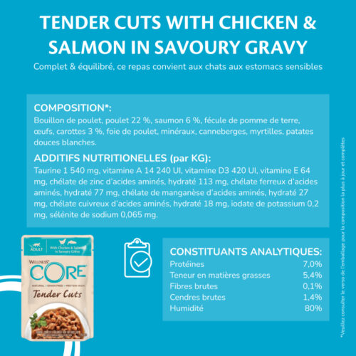Tender Cuts poulet & foie de poulet: Bouillon de poulet, poulet 25%, foie de poulet 6%, fécule de pomme de terre, œufs, carottes 3%, minéraux, canneberges, myrtilles, patates douces blanches. Tender Cuts poulet & saumon: Bouillon de poulet, poulet 22 %, saumon 6 %, fécule de pomme de terre, œufs, carottes 3 %, foie de poulet, minéraux, canneberges, myrtilles, patates douces blanches.