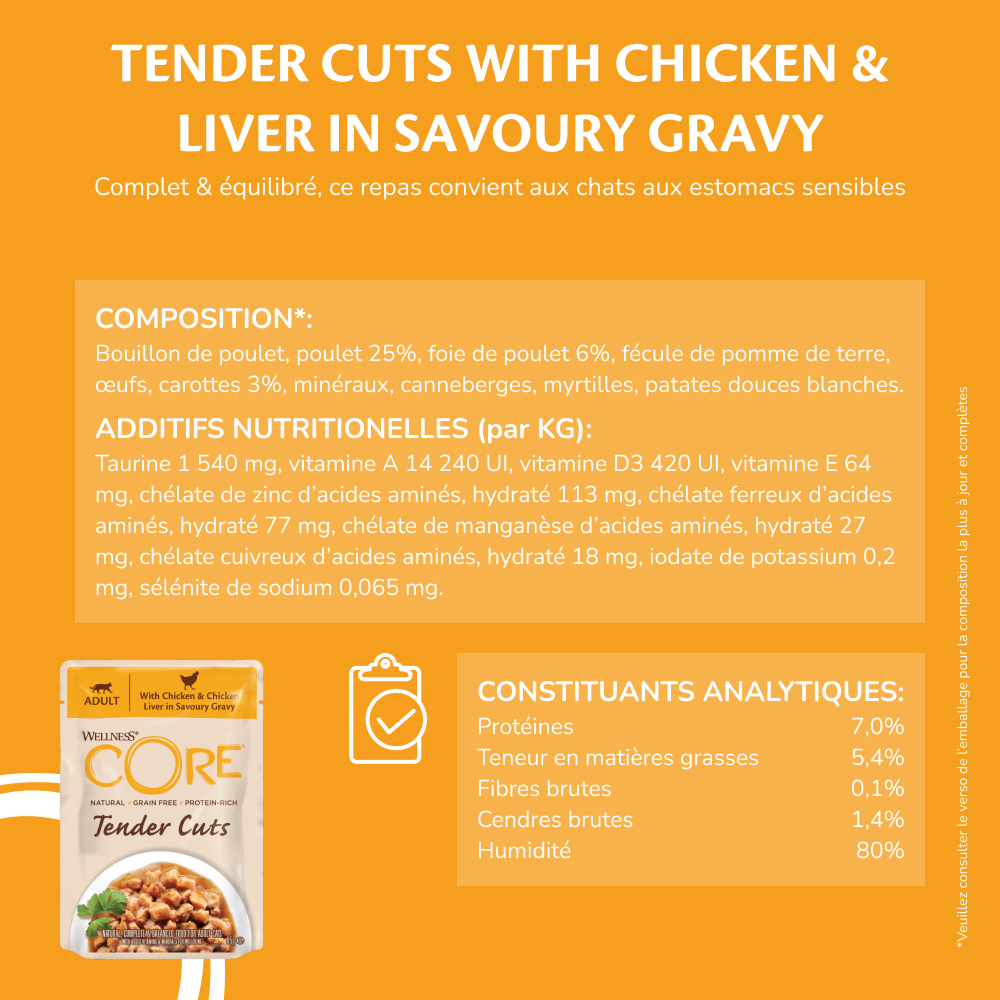 Wellness CORE Tender Cuts au poulet et au foie de poulet est un aliment complet pour chats adultes.