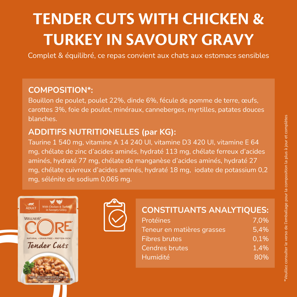 Wellness CORE Tender Cuts au poulet et à la dinde est un aliment complet pour chats adultes.