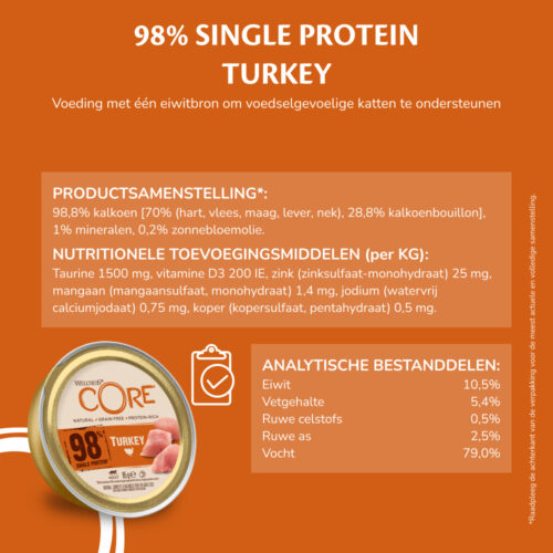 Onze Wellness CORE 98%* Turkey is een overheerlijk recept dat jouw kat een 100% natuurlijke, complete & evenwichtige maaltijd biedt. Gemaakt met meer dan 98% kalkoen uit één eiwitbron, ter ondersteuning van voedselgevoelige katten. Een heerlijke en smakelijke paté om te verzekeren dat jouw kat de voeding krijgt die hij nodig heeft om in topvorm te zijn en te blijven.