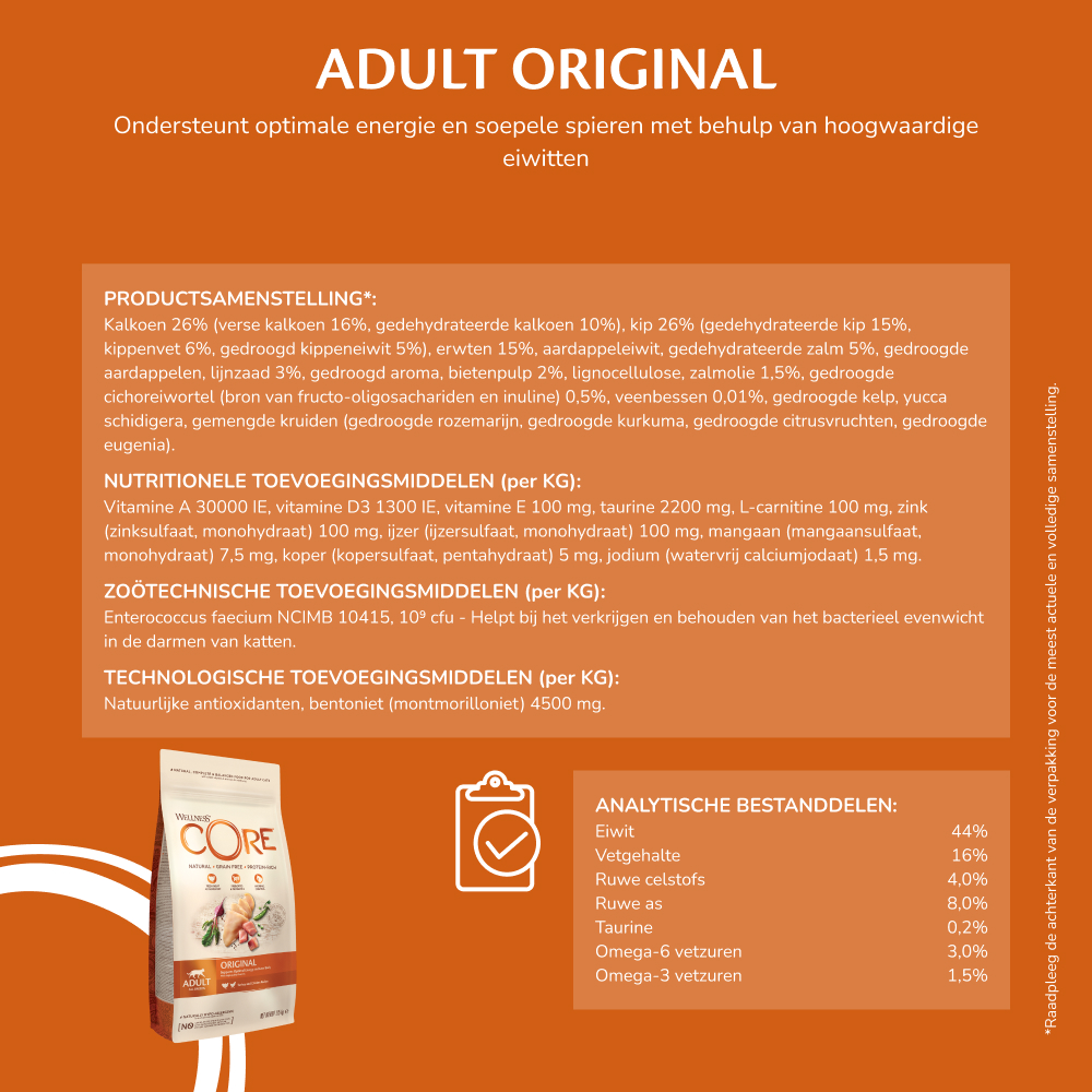Wellness CORE Adult Original werd ontwikkeld om optimale energie en soepele spieren van je kat te bevorderen met behulp van hoogwaardige eiwitten.