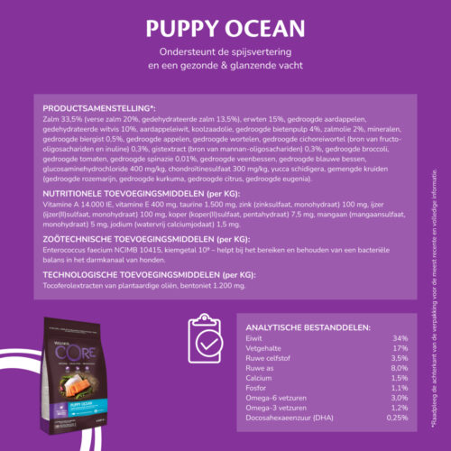 Onze Wellness CORE Puppy Ocean ondersteunt de spijsvertering en een gezonde & glanzende vacht dankzij pre- & probiotica en omega 3- & 6 vetzuren uit zalm. Naast graanvrij en eiwitrijk te zijn, heeft onze Wellness CORE Puppy Ocean vers zalm als het n°1 ingrediënt. Een natuurlijk recept met één hoogwaardige eiwitbron uit vlees, samen met een unieke combinatie van gezonde groenten en superfoods, waarbij vulstoffen en granen worden weggelaten. Wellness COREPuppy Ocean is een runds- en gevogeltevrij recept en is perfect voor honden die nood hebben aan een andere eiwitbron, of voor gevoelige honden die geen rund en/of gevogelte kunnen eten.
