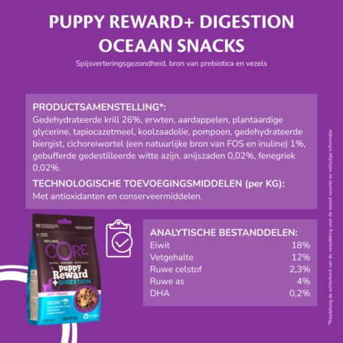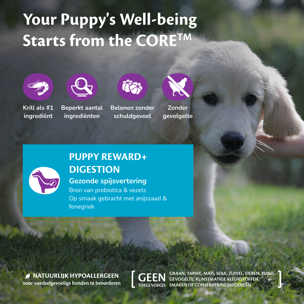 Bij Wellness CORE geloven we dat snacks meer moeten doen dan alleen lekker smaken. Onze Puppy Reward+ Ocean Recipe zachte snacks zijn vrij van kip en gemaakt met hoogwaardige oceaanproteïnen waar puppy’s dol op zijn. Verrijkt met DHA uit krill ter ondersteuning van de hersen- en oogontwikkeling, en met prebiotica, vezels, anijszaad en fenegriek voor een gezonde spijsvertering. De perfecte manier om te belonen én tegelijk de groei van je pup te voeden.