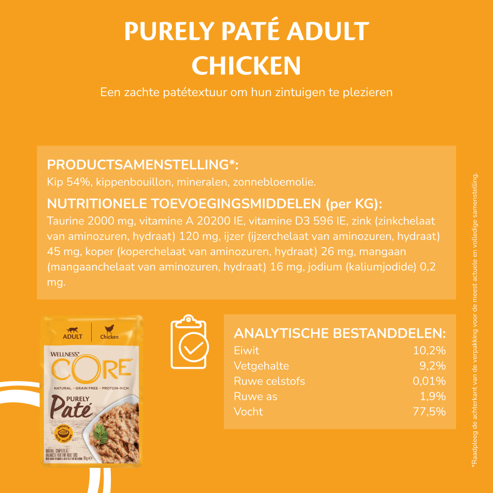 Wellness CORE is gebaseerd op de voedingsfilosofie dat katten, gezien hun oeroude voorouders, leven op een voedingspatroon dat voornamelijk uit vlees bestaat. Met een zachte paté textuur waar katten van houden en de eiwitrijke smaak waar ze naar verlangen, zijn onze nieuwe Wellness CORE Purely Patés zelfs een succes bij de meest kieskeurige katten!