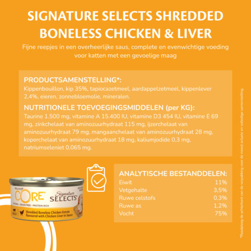 Wellness CORE Signature Selects Shredded, reepjes kipfilet met kippenlever in jus - 79g