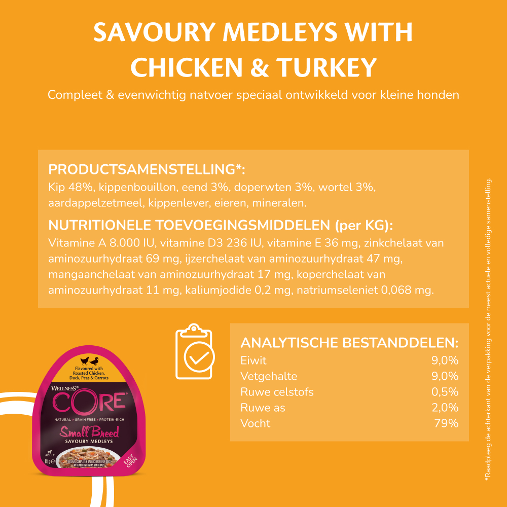 Wellness CORE Small Breed Savoury Medleys, Kip, Eend, Erwten en wortelen - 85g