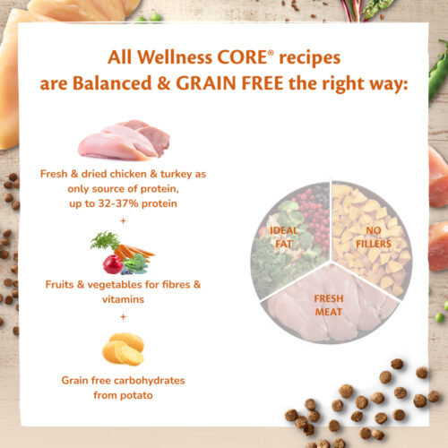 COMBINATIE VAN VOEDING: Als u met Wellness CORE nat voedsel voert, verminder de droge hoeveelheid met 19 g voor elke 80 g aan nat voer.