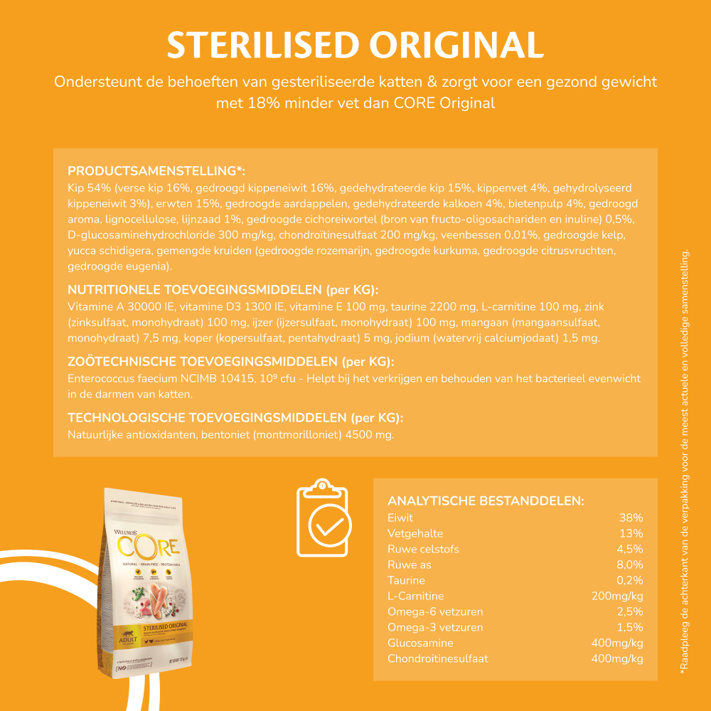 Met een verminderd aantal calorieën, voldoet Wellness CORE Sterilised Original aan de verminderde noden van minder actieve of gesteriliseerde katten.