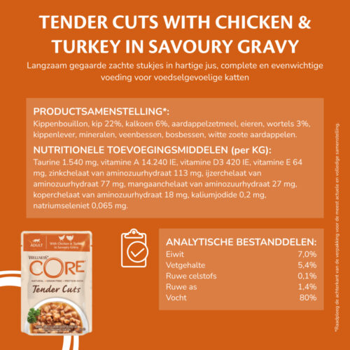 Wellness CORE Tender Cuts met kip en kalkoen is een complete voeding voor volwassen katten.