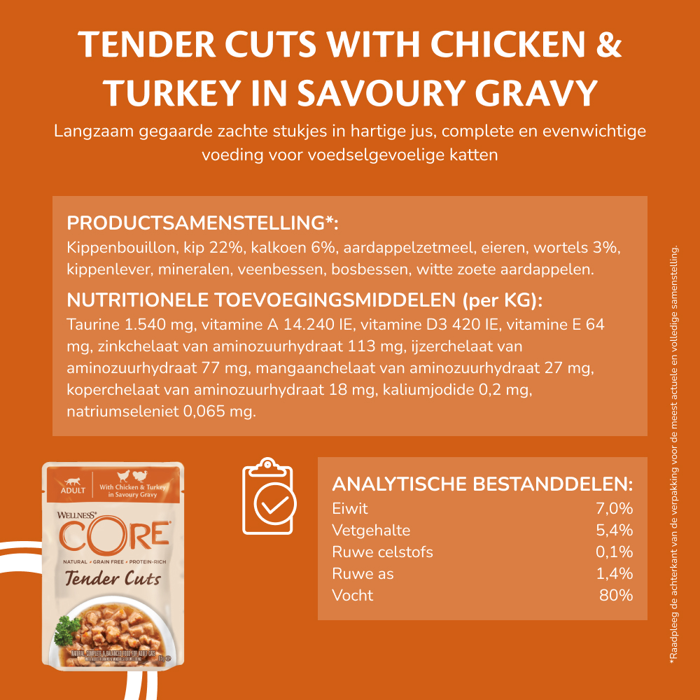 Wellness CORE Tender Cuts, kip en kalkoen in een hartige jus - 85g