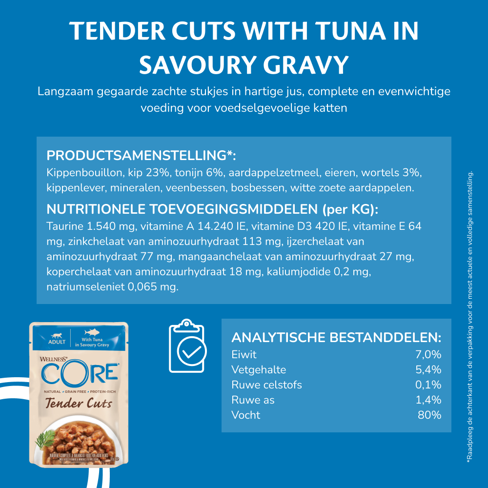 Wellness CORE Tender Cuts met tonijn is een complete voeding voor volwassen katten.