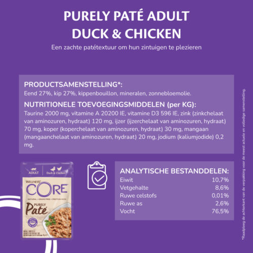 Wellness CORE is gebaseerd op de voedingsfilosofie dat katten, gezien hun oeroude voorouders, leven op een voedingspatroon dat voornamelijk uit vlees bestaat. Met een zachte paté textuur waar katten van houden en de eiwitrijke smaak waar ze naar verlangen, zijn onze nieuwe Wellness CORE Purely Patés zelfs een succes bij de meest kieskeurige katten!