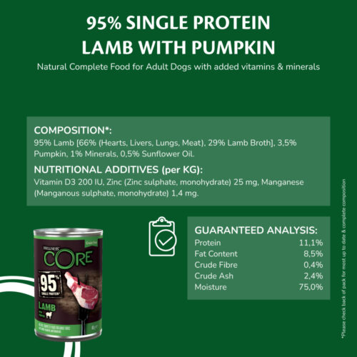 Onze Wellness CORE 95% Lam met pompoen is een overheerlijk recept dat garant staat voor een natuurlijke, complete & evenwichtige maaltijd: gemaakt van 95%* lam, gecombineerd met overheerlijke stukjes groenten.