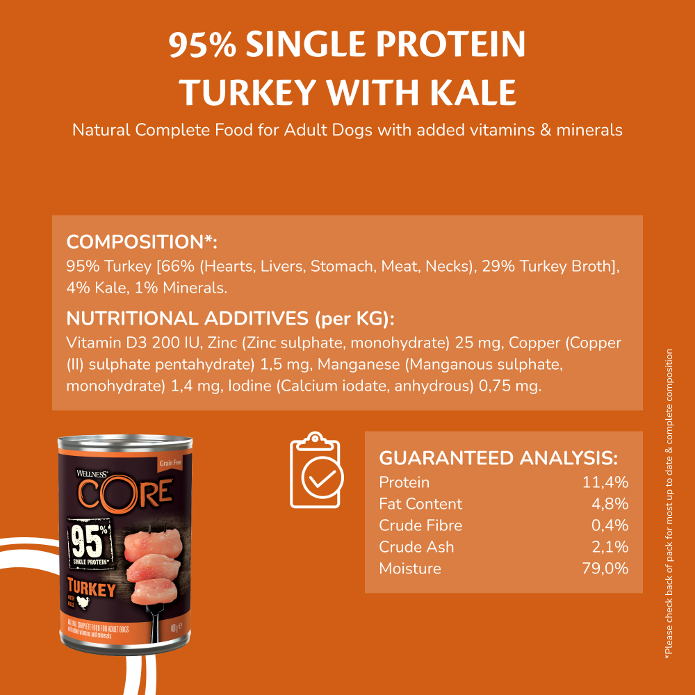 Onze Wellness CORE 95% Kalkoen met boerenkool is een overheerlijk recept dat garant staat voor een natuurlijke, complete & evenwichtige maaltijd: gemaakt van 95%* kalkoen, gecombineerd met overheerlijke stukjes groenten.