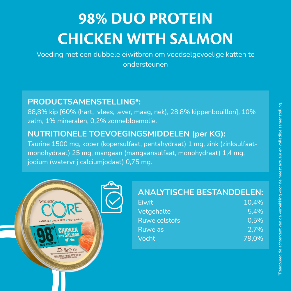 Onze Wellness CORE 98%* Chicken with Salmon is een overheerlijk recept dat jouw kat een 100% natuurlijke, complete & evenwichtige maaltijd biedt. Gemaakt met meer dan 88% kip en 10% zalm uit een dubbele eiwitbron, ter ondersteuning van voedselgevoelige katten. Een heerlijke en smakelijke paté om te verzekeren dat jouw kat de voeding krijgt die hij nodig heeft om in topvorm te zijn en te blijven.