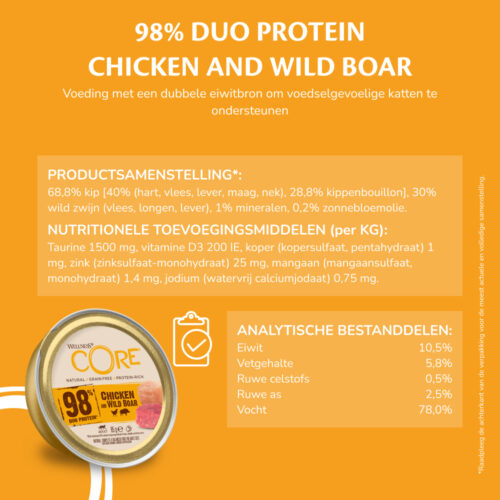 Onze Wellness CORE 98%* Chicken & Wild Boar is een overheerlijk recept dat jouw kat een 100% natuurlijke, complete & evenwichtige maaltijd biedt. Gemaakt met meer dan 68% kip en 30% everzwijn uit een dubbele eiwitbron, ter ondersteuning van voedselgevoelige katten. Een heerlijke en smakelijke paté om te verzekeren dat jouw kat de voeding krijgt die hij nodig heeft om in topvorm te zijn en te blijven.