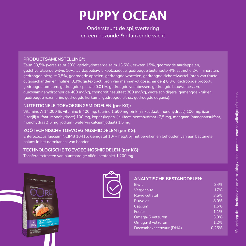 Onze Wellness CORE Puppy Ocean ondersteunt de spijsvertering en een gezonde & glanzende vacht dankzij pre- & probiotica en omega 3- & 6 vetzuren uit zalm. Naast graanvrij en eiwitrijk te zijn, heeft onze Wellness CORE Puppy Ocean vers zalm als het n°1 ingrediënt. Een natuurlijk recept met één hoogwaardige eiwitbron uit vlees, samen met een unieke combinatie van gezonde groenten en superfoods, waarbij vulstoffen en granen worden weggelaten. Wellness COREPuppy Ocean is een runds- en gevogeltevrij recept en is perfect voor honden die nood hebben aan een andere eiwitbron, of voor gevoelige honden die geen rund en/of gevogelte kunnen eten.