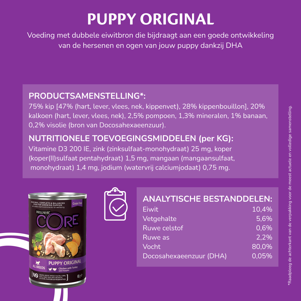 Onze Wellness CORE Puppy Original Kip en kalkoen met pompoen is een overheerlijk graanvrij recept dat garant staat voor een 100% natuurlijke, complete & evenwichtige maaltijd voor je puppy: gemaakt uit 95% dierlijke ingrediënten uit een dubbele eiwitbron en verrijkt met vitaminen en mineralen, waardoor je puppy de beste start krijgt in het leven.