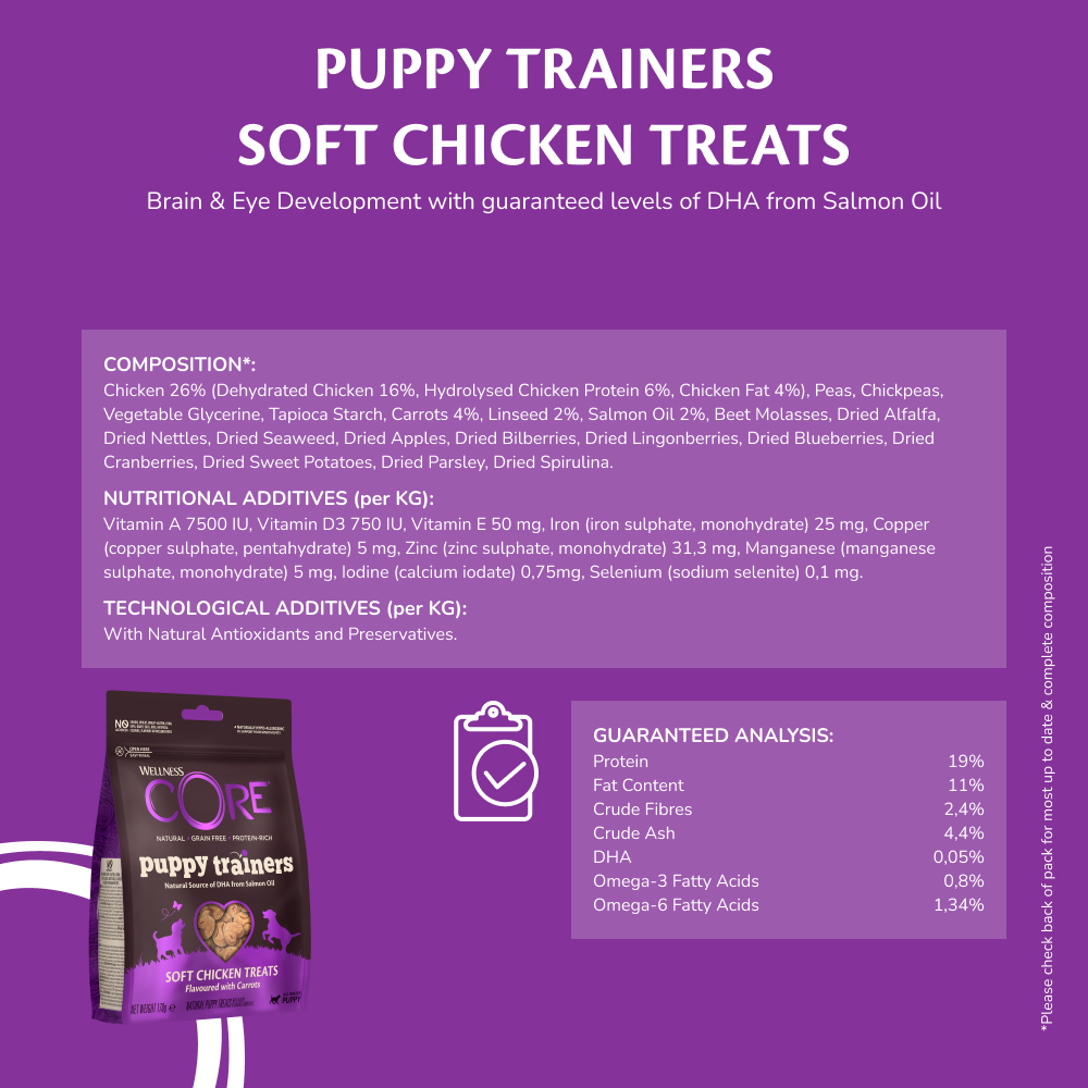 Onze Wellness CORE Puppy Trainers kip met wortel zijn de beste aanvulling op onze CORE droge en natte voeding. Het is een natuurlijk krokante snack, vervaardigd met een smaakvol eiwit, gezonde antioxidanten en lijnzaad om het welzijn van jouw puppy te bevorderen. Bovendien bevorderen ze ook de ontwikkeling van de hersenen an de ogen dankzij DHA uit zalmolie. Verder zijn ze perfect om mee te trainen of simpelweg als een gezonde snack.