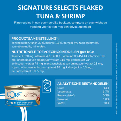 Wellness CORE Signature Selects Flaked, fijne reepjes Skipjack tonijn met garnalen in bouillon - 79g