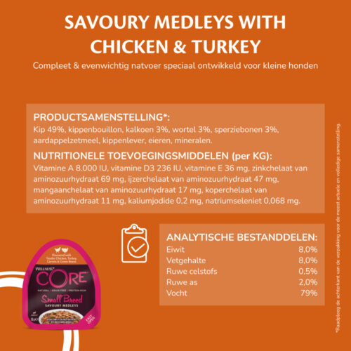 Wellness CORE Small Breed Savoury Medleys met kip, kalkoen, wortel en sperziebonen is een complete voeding voor volwassen honden.