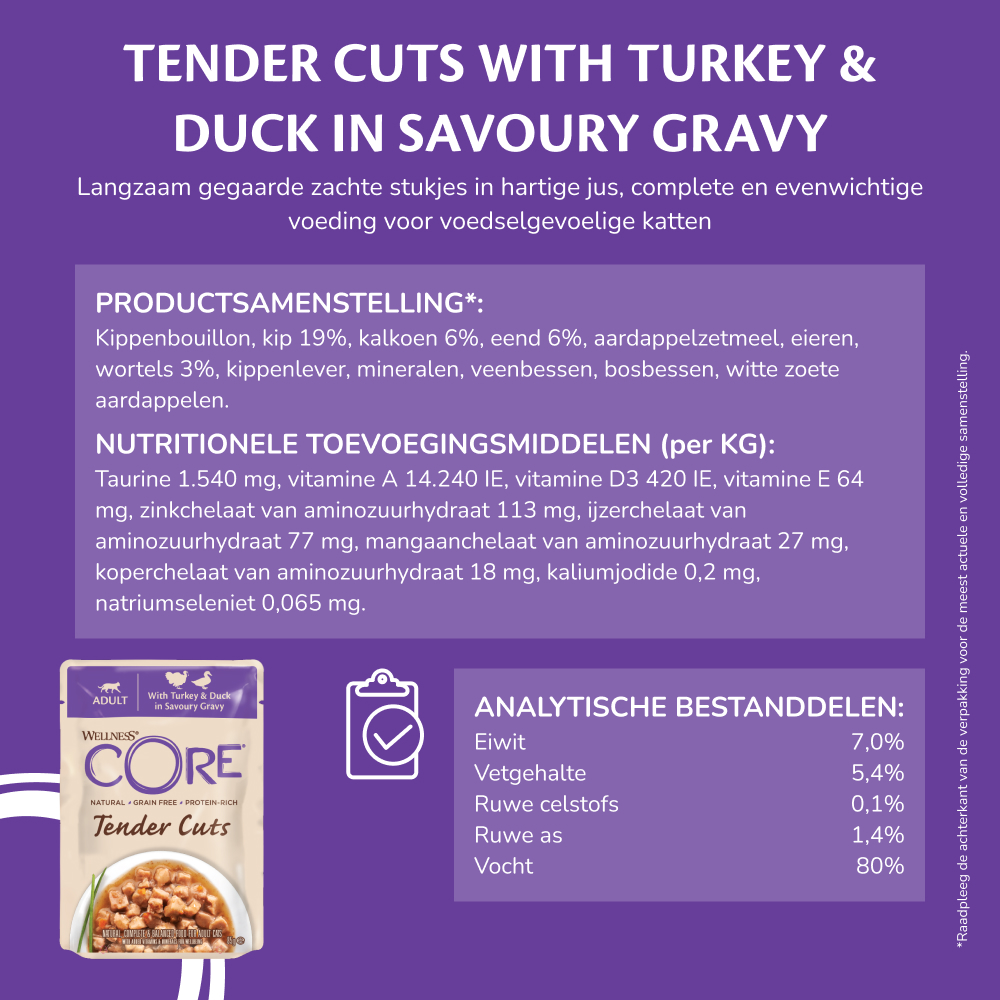 Tender Cuts met kalkoen & eend: Kippenbouillon, kip 19%, kalkoen 6%, eend 6%, aardappelzetmeel, eieren, wortels 3%, kippenlever, mineralen, veenbessen, bosbessen, witte zoete aardappelen.