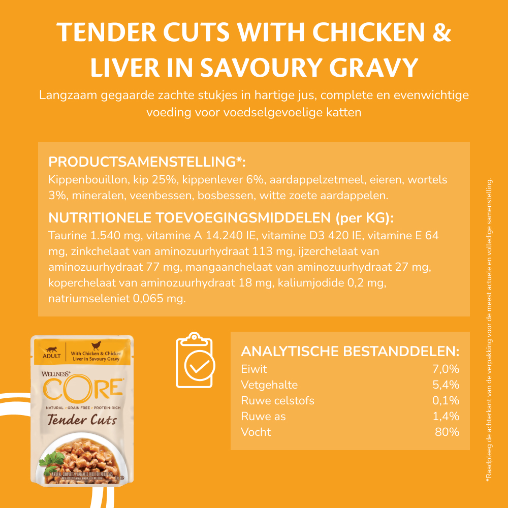 Wellness CORE Tender Cuts, kip en kippenlever in een hartige jus - 85g