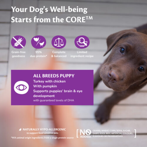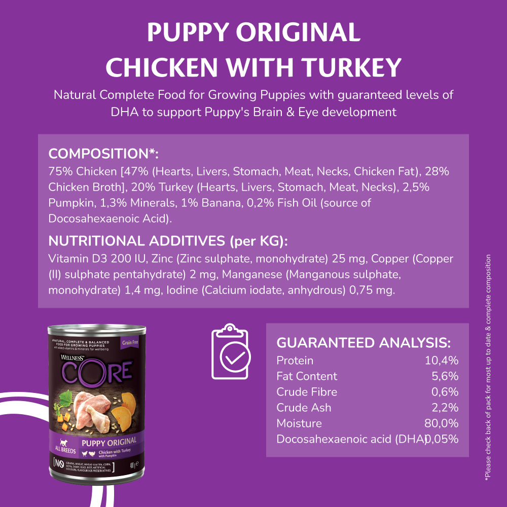 CORE 95 % Puppy Original boksemat er sammensatt med to proteinkilder fra animalske proteiner, samt superfood rik på antioksidanter. Denne boksematen inneholder kylling, kalkun og gresskar. CORE 95 % Puppy Original er naturlig, kornfritt med høyt proteininnhold beriket med vitaminer og mineraler som bidrar til at valpen din får ernæringen den trenger når den er i vekst. Kan serveres som et komplett måltid eller kombineres sammen med CORE tørrfôr.