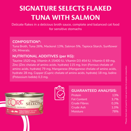 CORE Signature Selects et naturlig komplett og balansert måltid som gir katten din proteiner, smaker og teksturer den vil elske. Signature Selects fåes i tre ulike konsistenser, chunky (biter), shredded (strimler) og flaked (flak), alle serveres i en utsøkt saus.