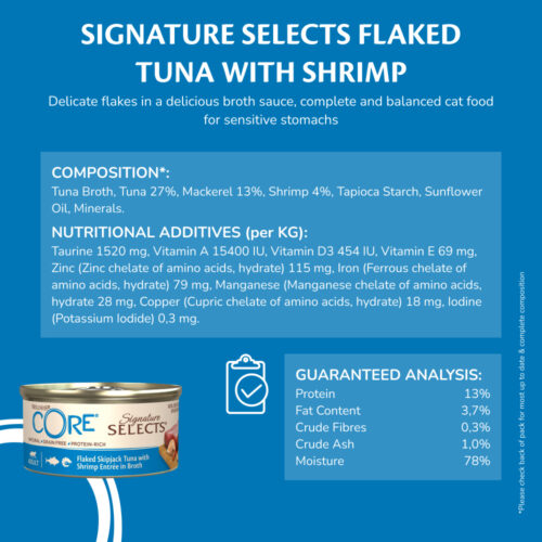 CORE Signature Selects et naturlig komplett og balansert måltid som gir katten din proteiner, smaker og teksturer den vil elske. Signature Selects fåes i tre ulike konsistenser, chunky (biter), shredded (strimler) og flaked (flak), alle serveres i en utsøkt saus.