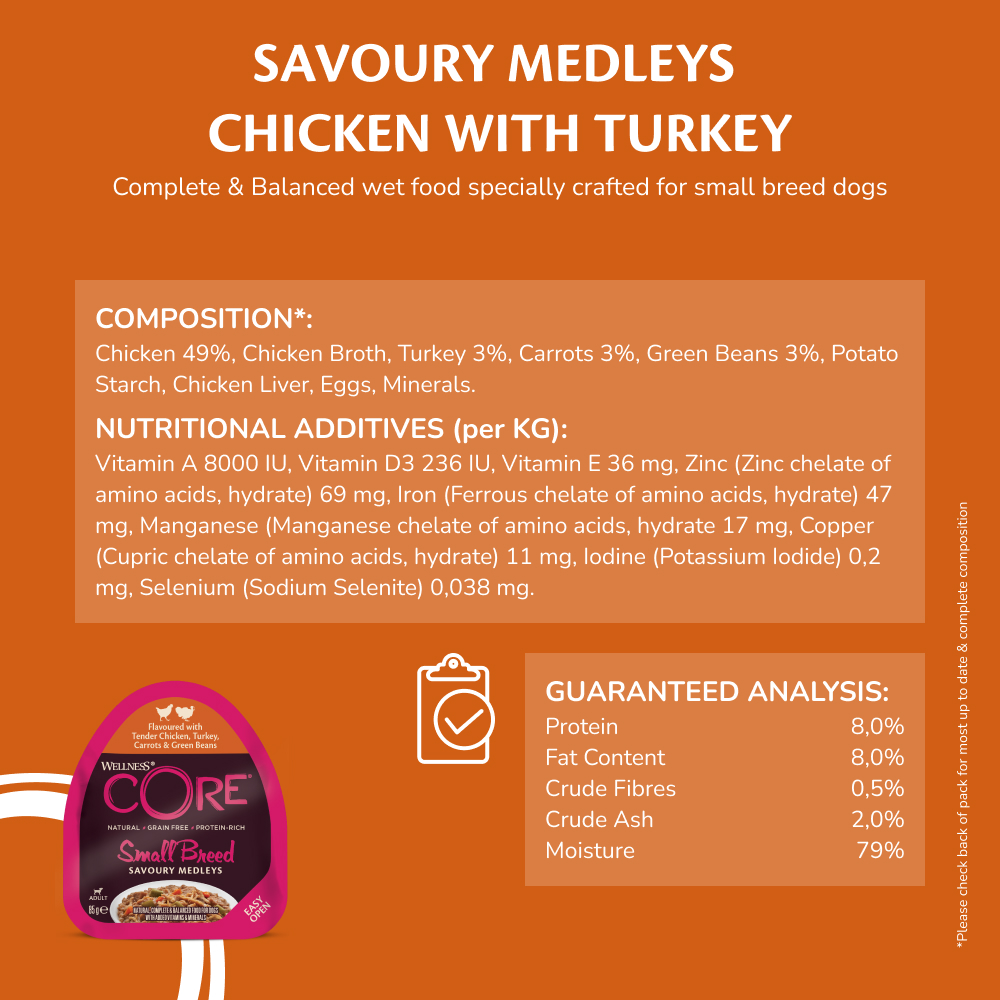 Wellness CORE Small Breed Savoury Medleys Flavoured with Tender Chicken, Turkey, Carrots & Green Beans - 85g